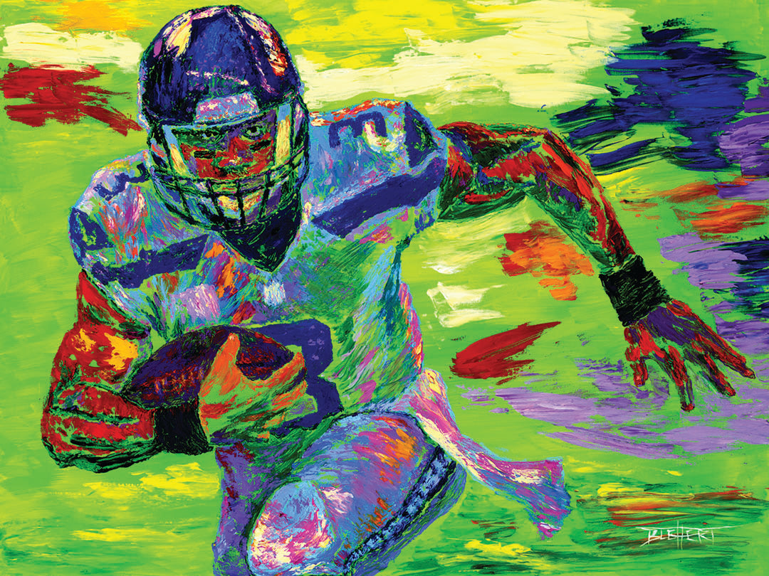 Learn about the art of football with "Coming Through" by Robert Blehert. This masterfully painted piece showcases the dynamic movement of Seattle Seahawks' quarterback Russell Wilson as he runs with the ball. Made in the USA with a bright green background and splashes of color, this painting displays truly impressive technique.