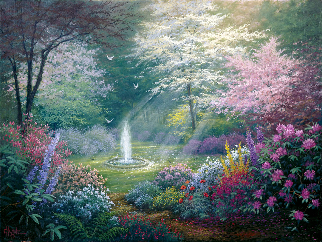 Experience a breathtaking abundance of nature with "Garden of Promise" by Charles White, a stunning painting showcasing a luscious garden filled with a variety of flowers, including lavender and poppies, alongside blooming pink and white trees. The white doves flying through sunbeams add a touch of serenity to this scene, creating a truly mesmerizing work of art. Hand-crafted by the artist in the USA.