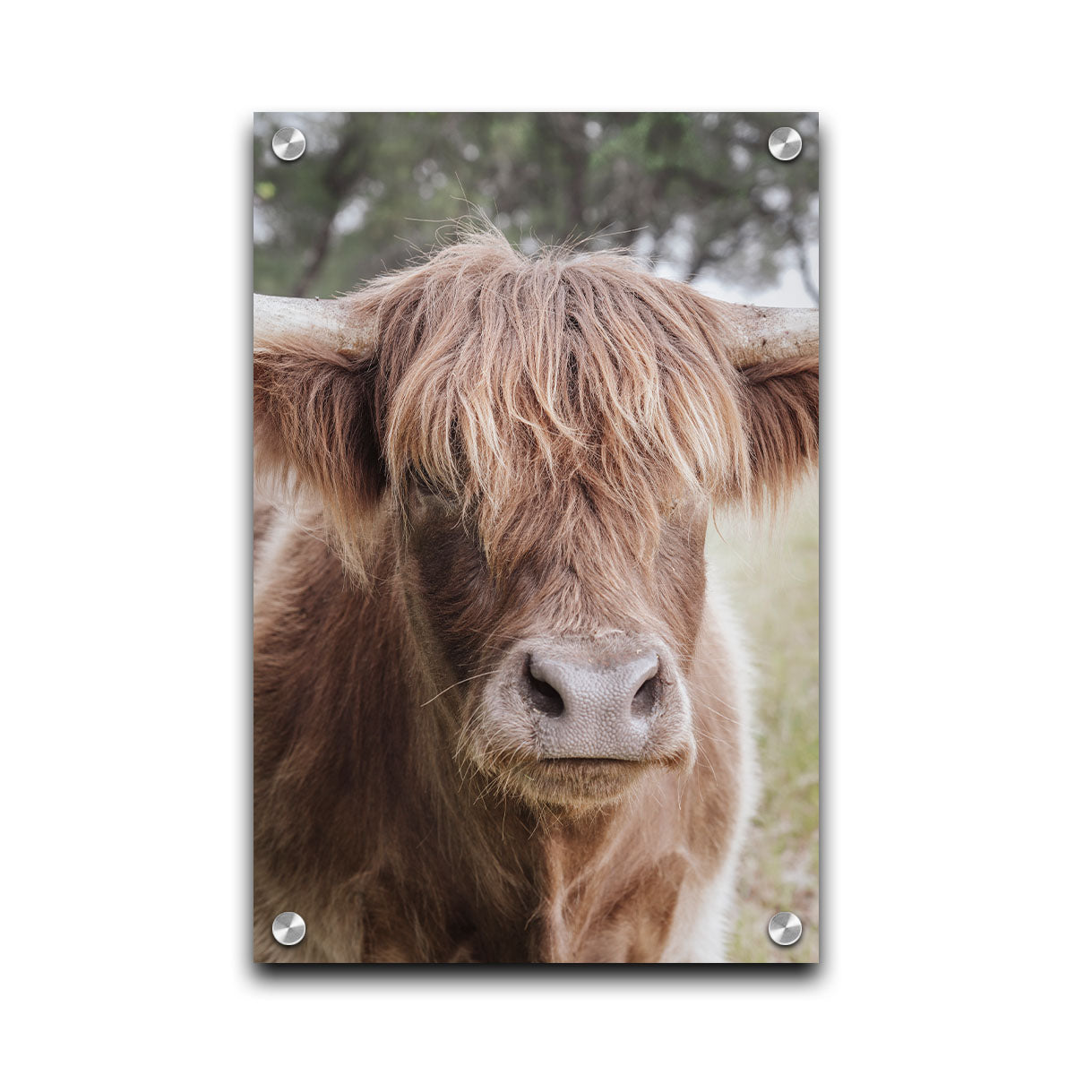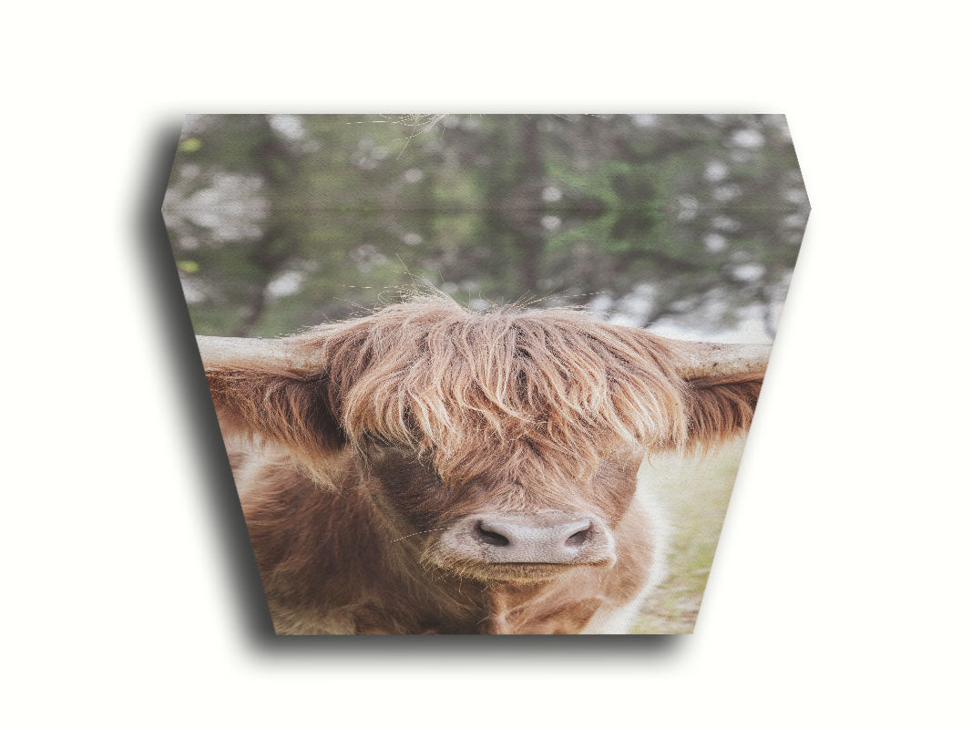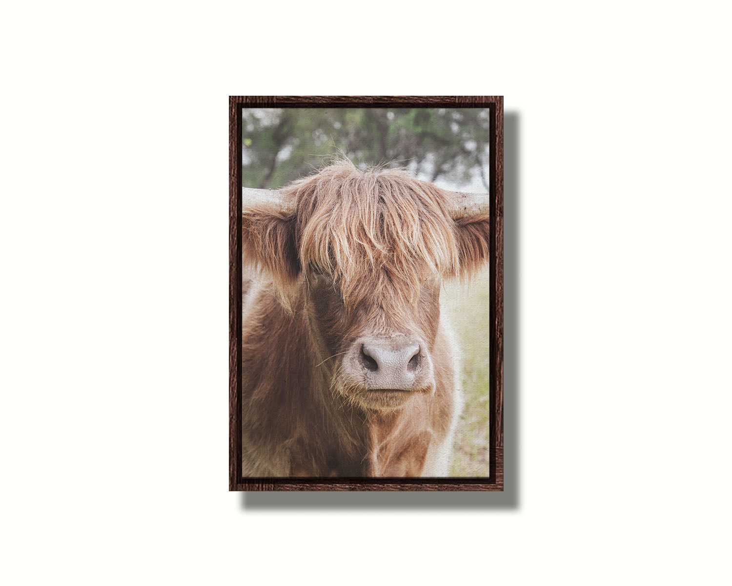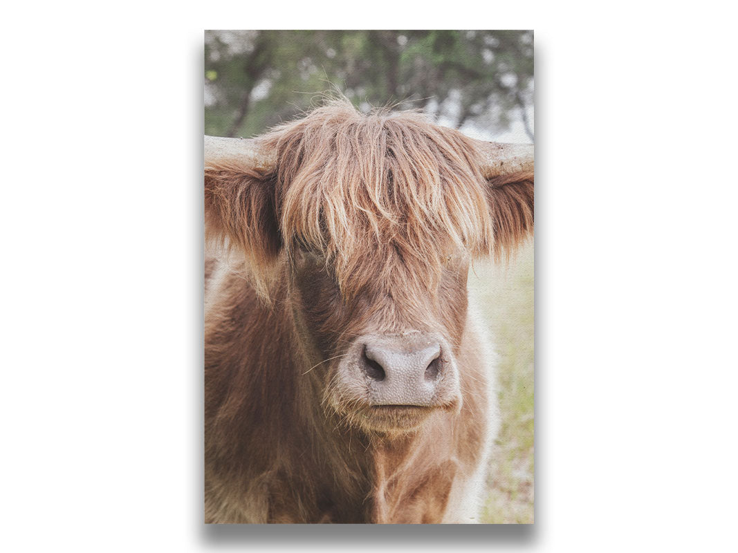 "Highland Portrait" by Kelly Wade depicts Scotland's iconic cattle breed in stunning detail. This exquisite close-up photograph showcases the charming features and intricate fur textures of a highland cow, bringing rustic elegance to any space. Each premium print is proudly produced in the USA, ensuring exceptional quality for this captivating piece of bovine artistry.