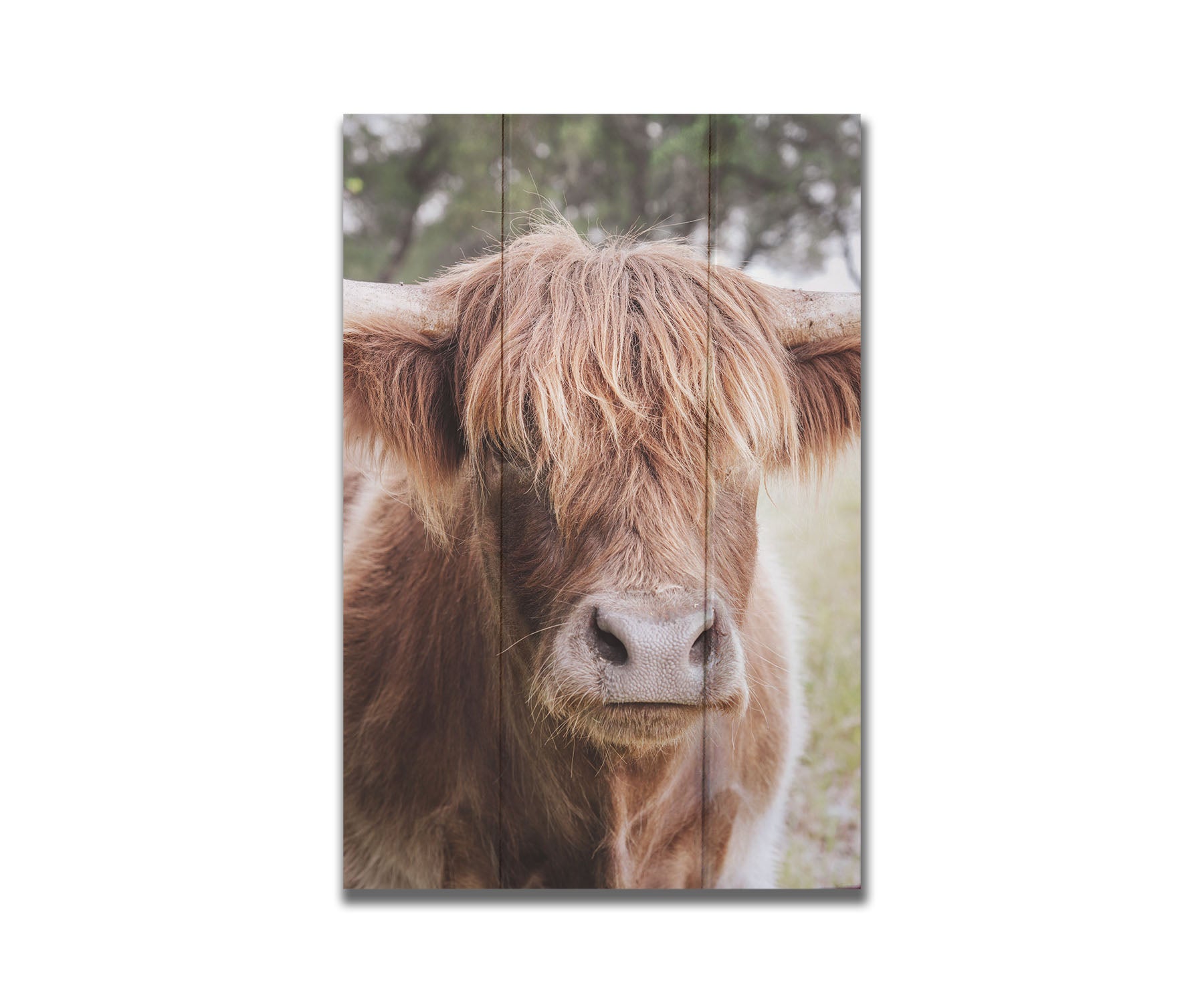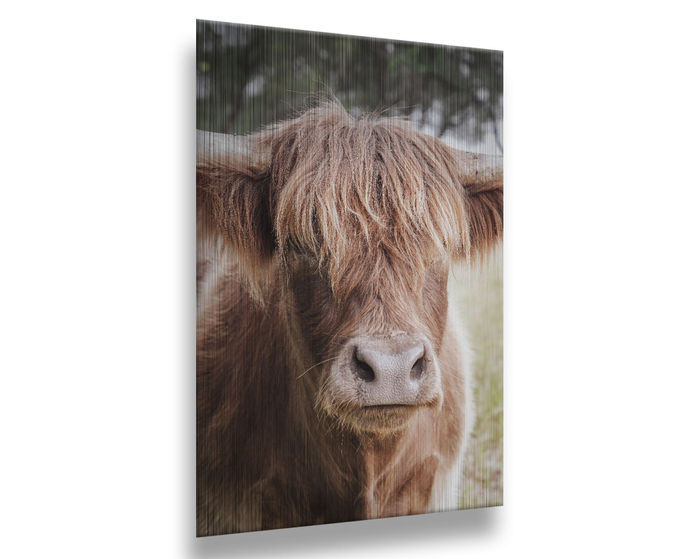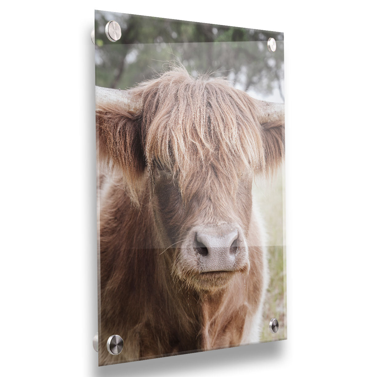 "Highland Portrait" by Kelly Wade depicts Scotland's iconic cattle breed in stunning detail. This exquisite close-up photograph showcases the charming features and intricate fur textures of a highland cow, bringing rustic elegance to any space. Each premium print is proudly produced in the USA, ensuring exceptional quality for this captivating piece of bovine artistry.