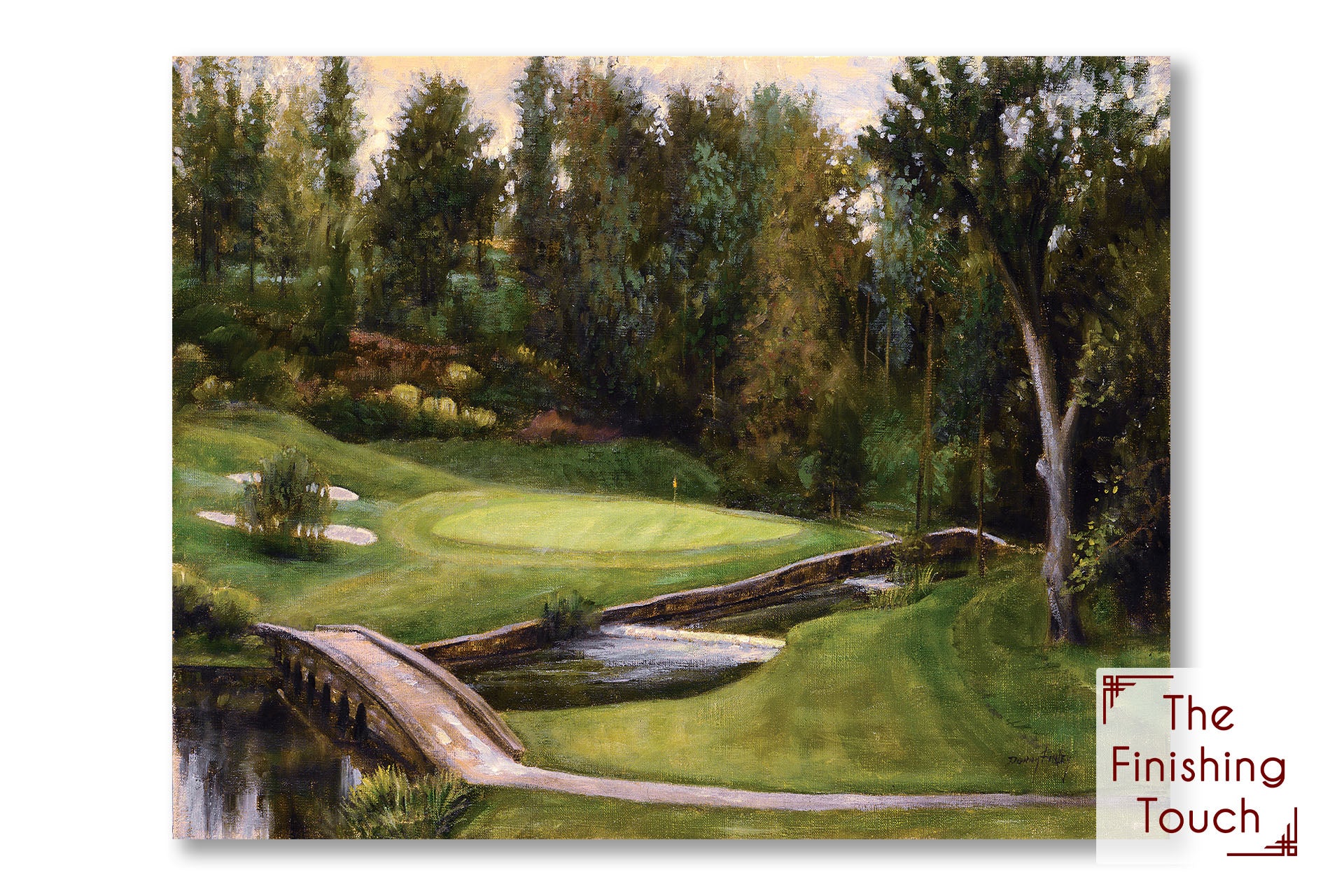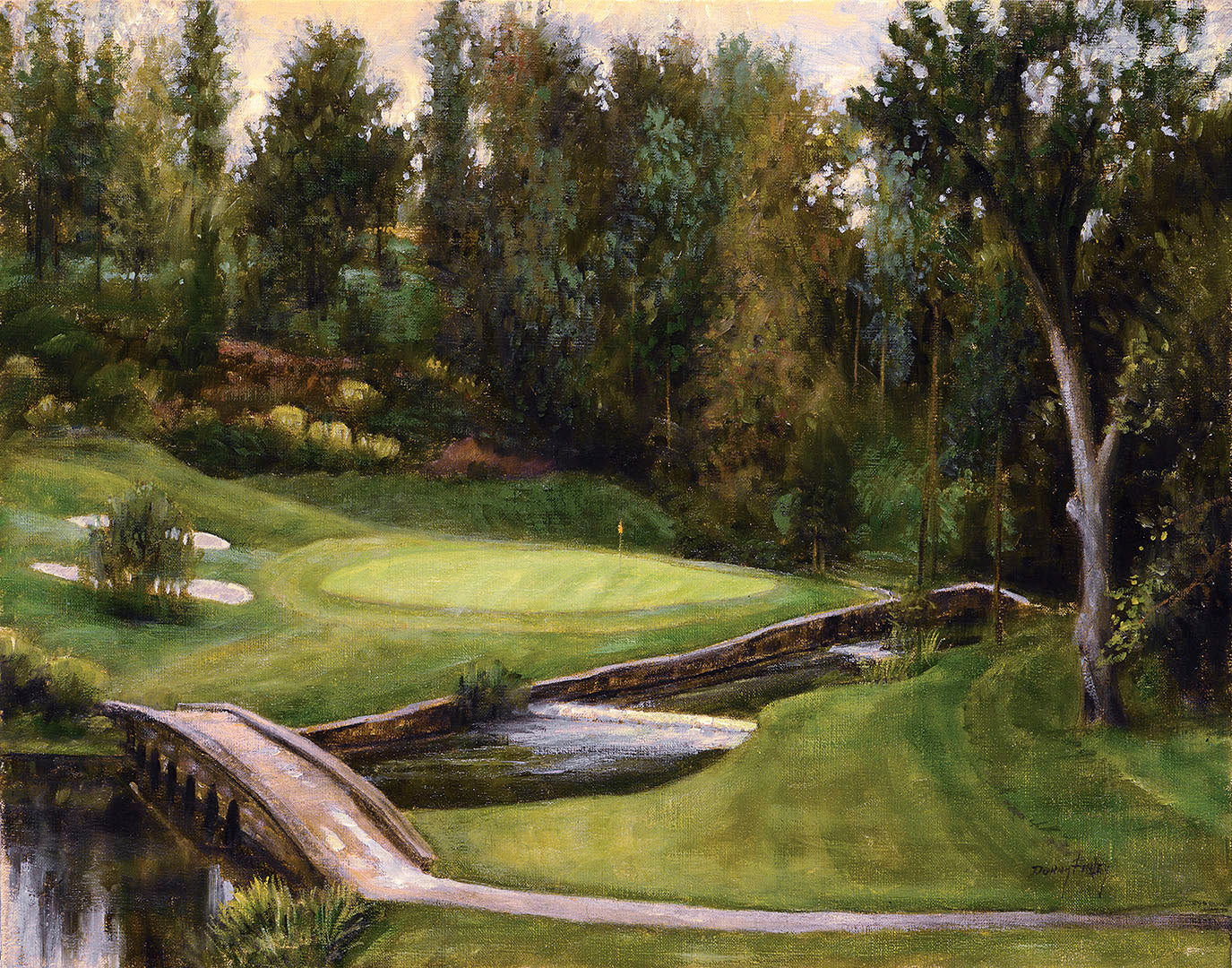 Donny Finley’s "Little Bridge on the Golf Course" is a beautiful landscape painting focused on a bridge crossing a stream, framed by trees in the background. This quality print explores the expert landscaping of a golf course, which golfers are sure to appreciate.