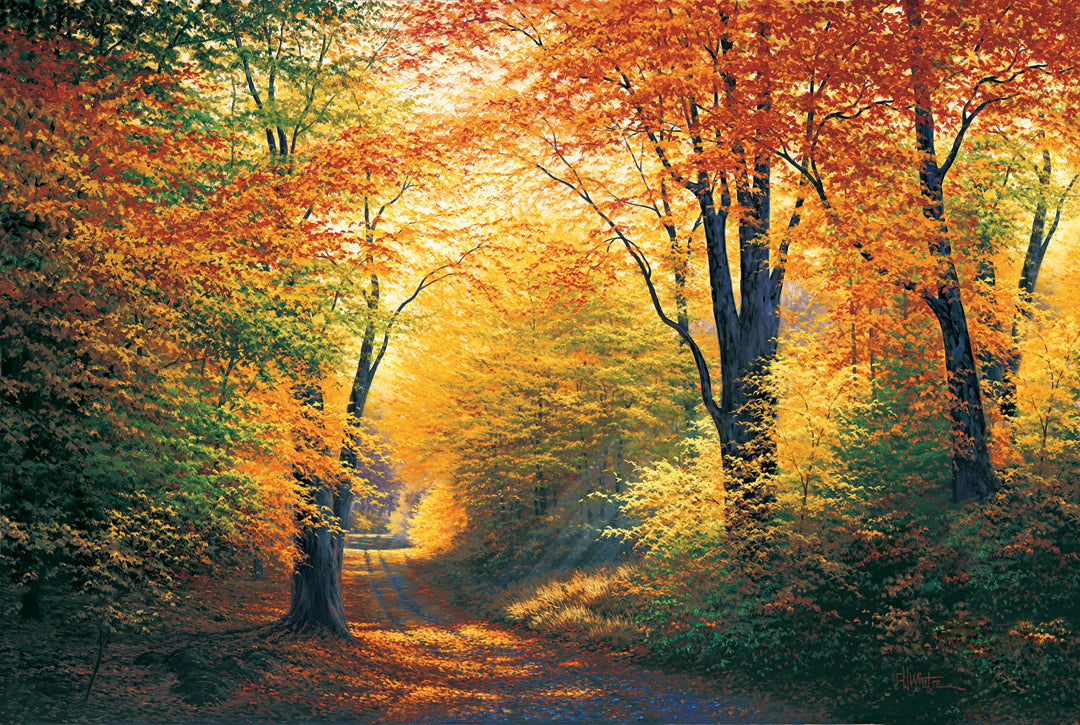 Discover the beauty of the "Path Worth Taking" by Charles White. Admire this stunning painting, featuring an autumn forest with trees lining a thin road. The golden sunlight glinting through the trees adds a touch of warmth to any room. Expertly made in the USA.