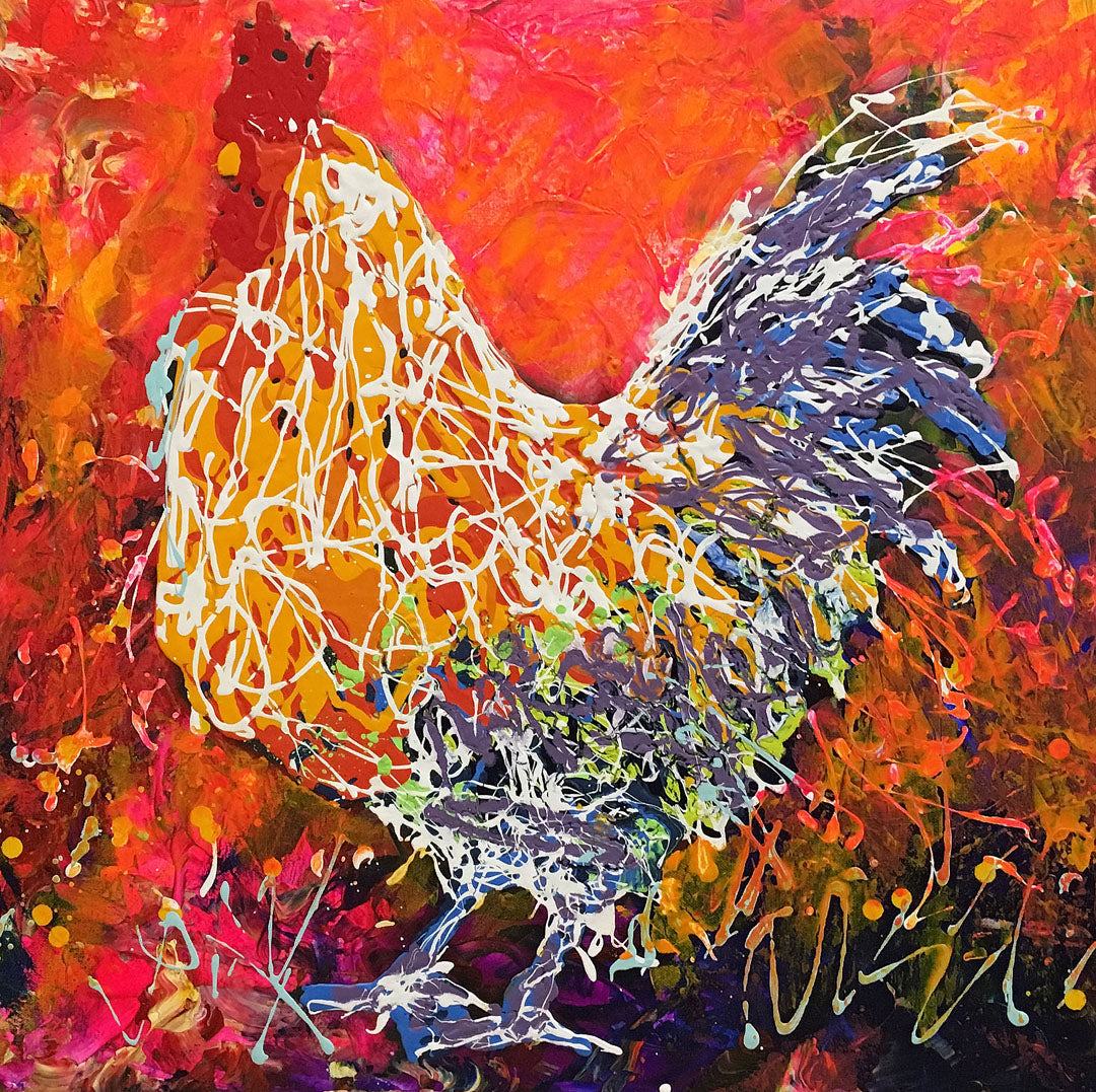 Introduce a unique piece of art to your collection with "Quincy the Rooster" by Jeff Boutin. Featuring a striking drip painting technique, this colorful rooster stands out with its bold, textured red, orange, pink, and purple background. Made in the USA, this piece is sure to add a touch of vibrant charm to any space.