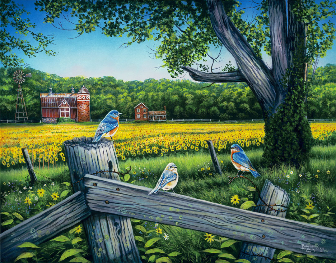 Introducing the stunning artwork "Sunflower Valley Blues" by Robert Andrea, featuring a picturesque field of sunflowers. This piece captures the beauty of nature with vibrant sunflowers, charming songbirds, and a rustic barn nestled in the valley. The attention to detail creates a peaceful and inviting atmosphere. This artwork is sure to add a touch of nature's beauty to any home or office. Don't miss out on the chance to bring "Sunflower Valley Blues" into your life.