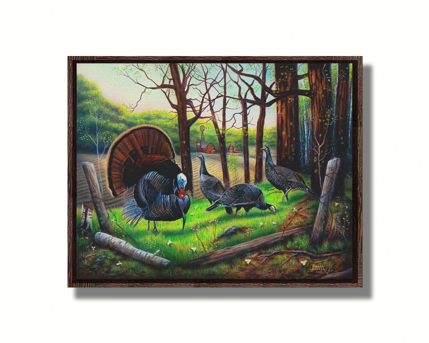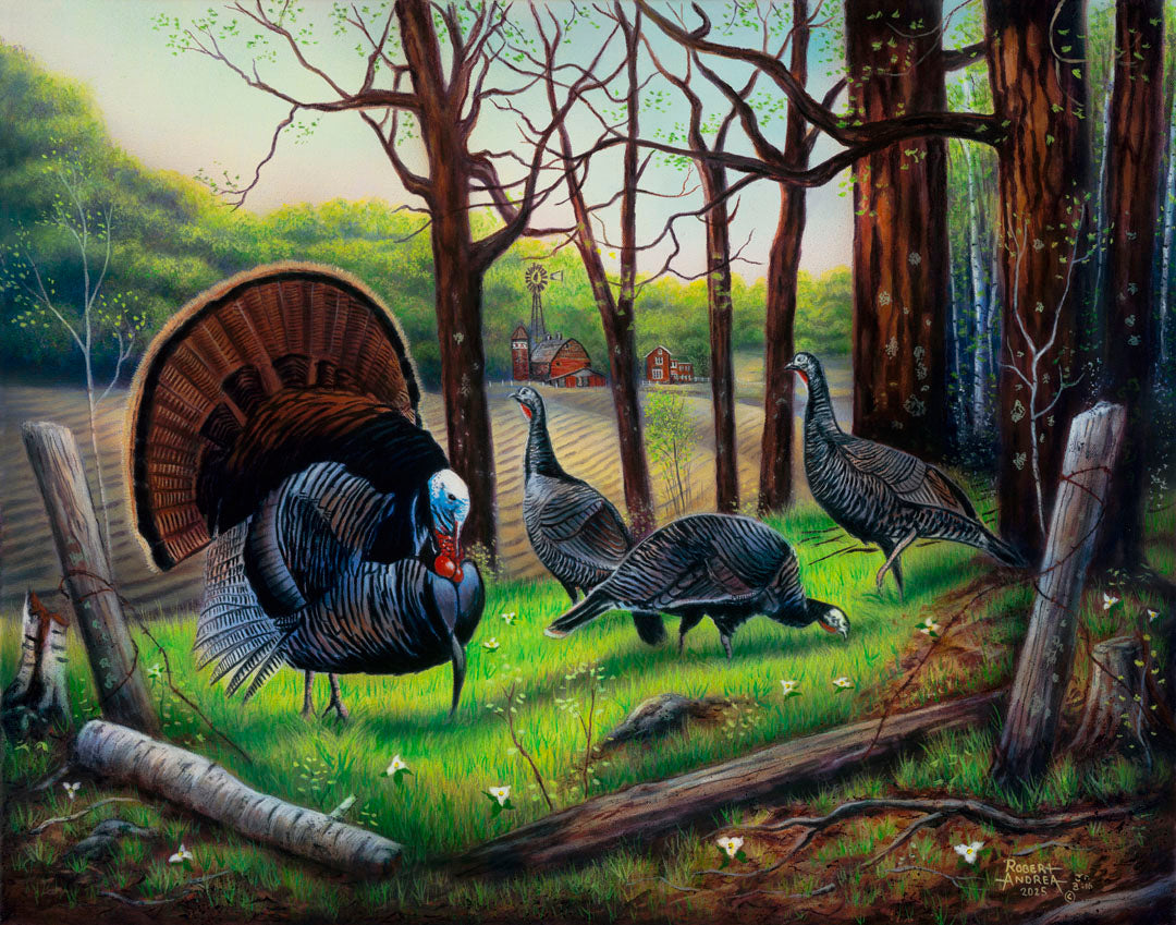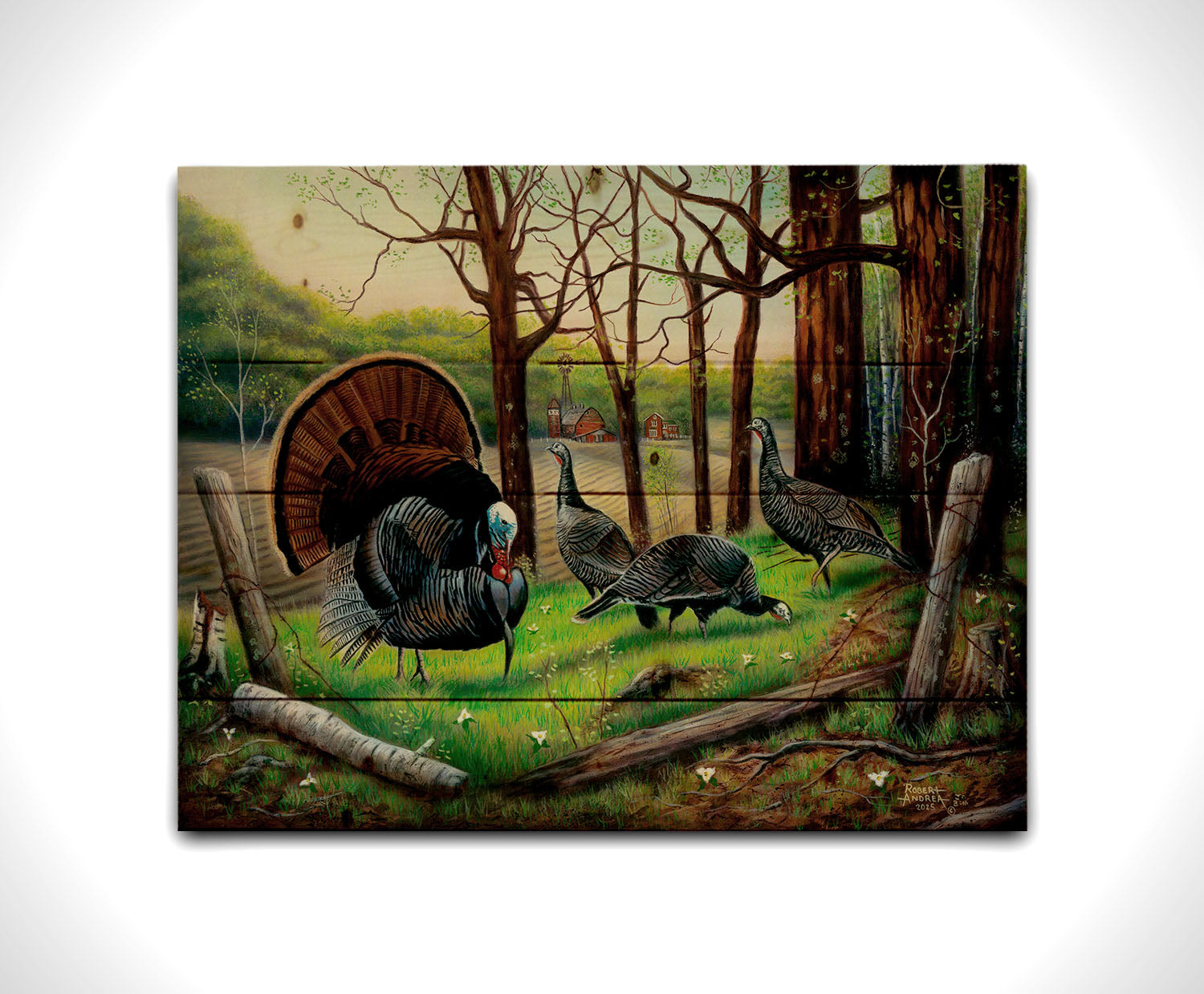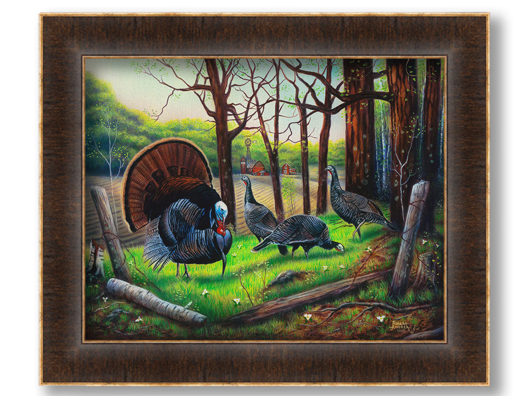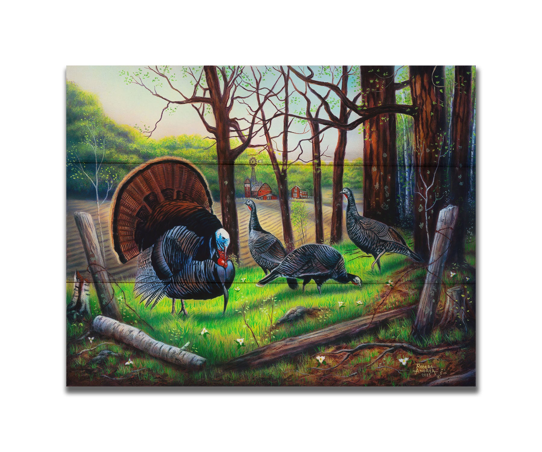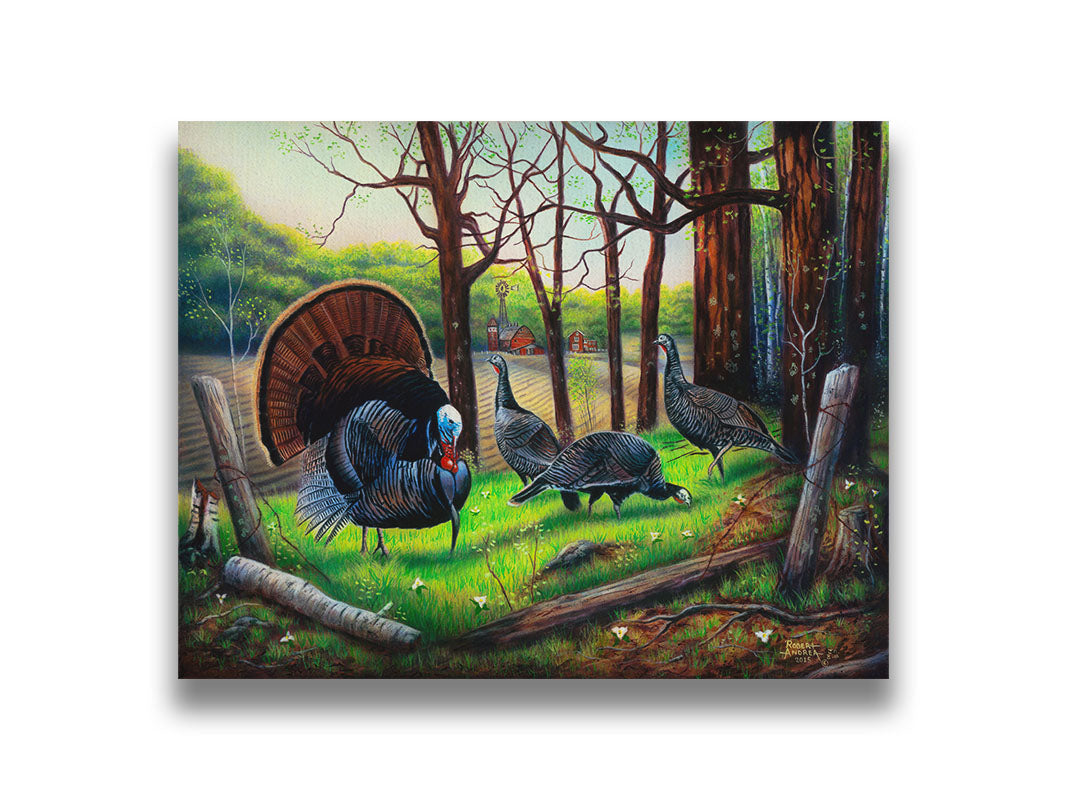"Turkey Ridge" by Robert Andrea is a wildlife painting depicting a rafter of turkeys standing in the woods, at the border of a tilled farm field. Perfect for hunters and those who crave the wilderness, this piece is made in the USA with meticulous attention to detail. Let this captivating work of art add a touch of life to your home.