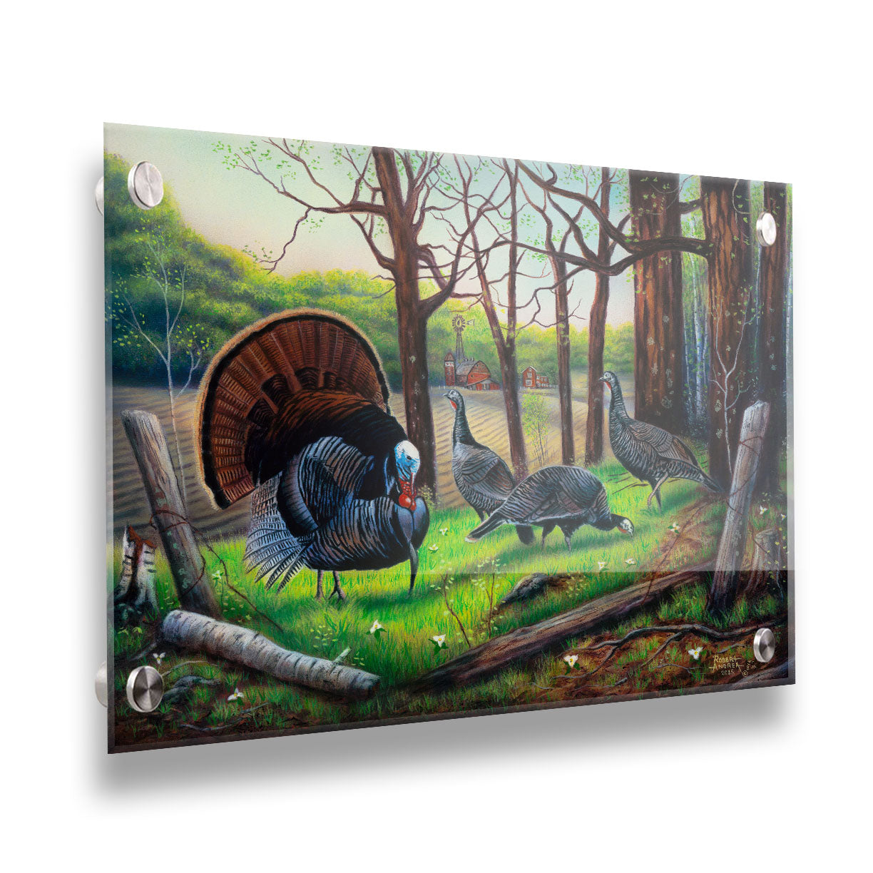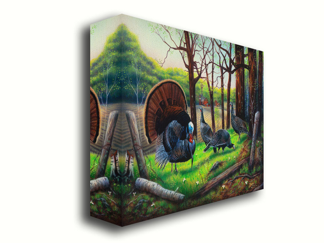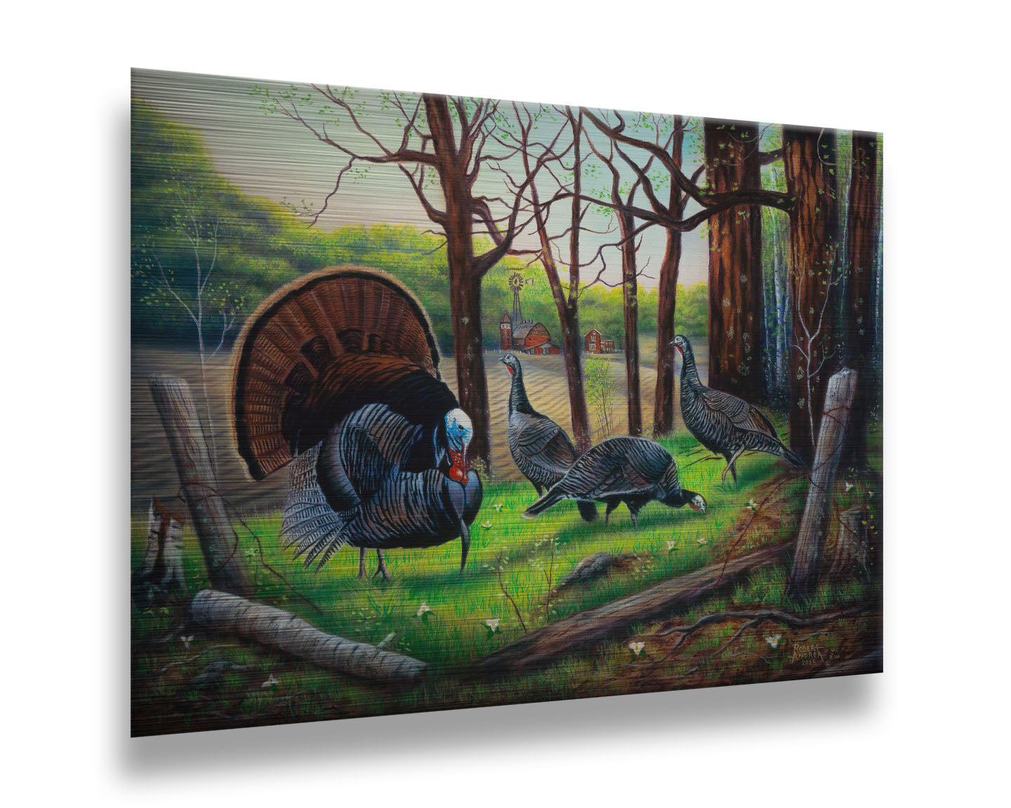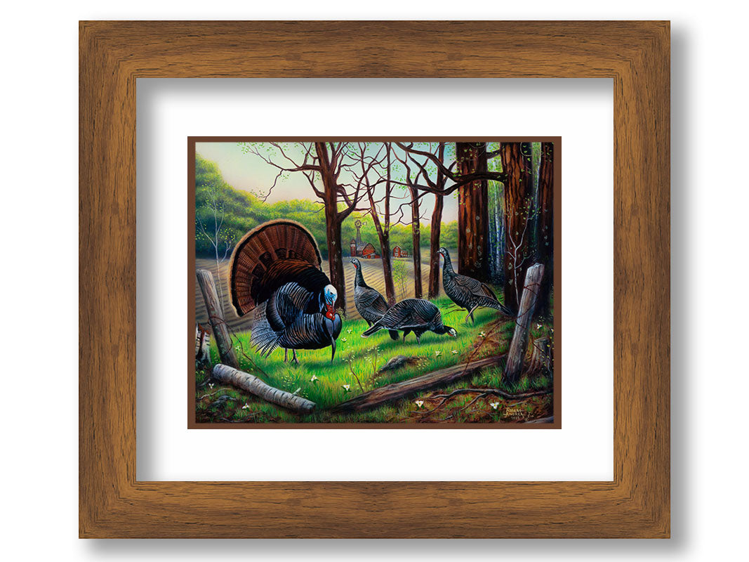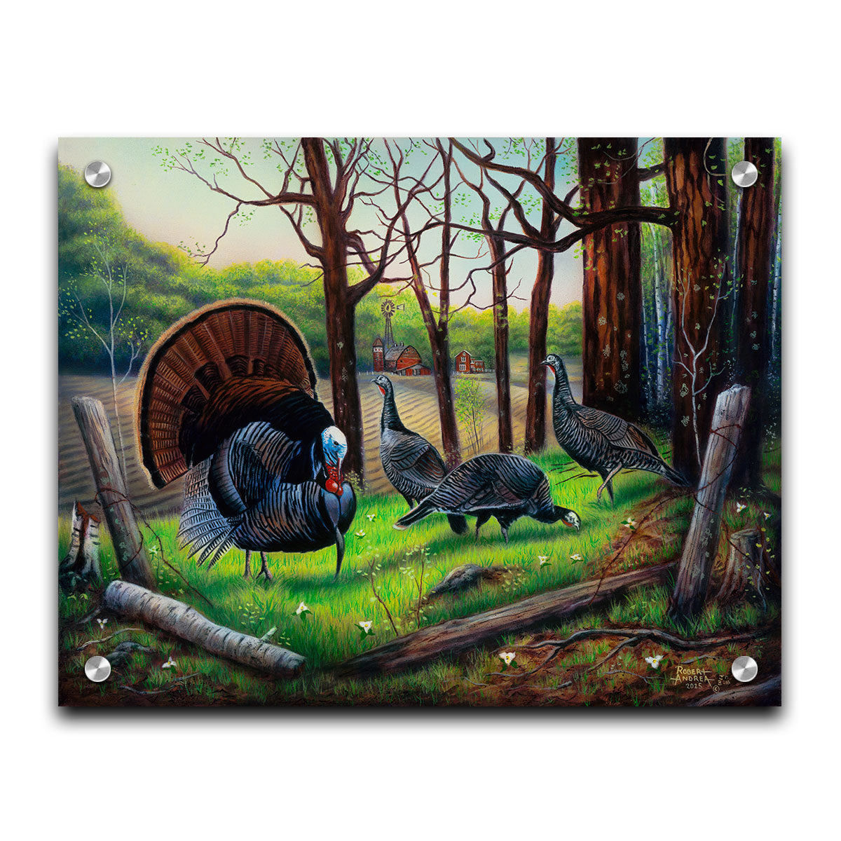 "Turkey Ridge" by Robert Andrea is a wildlife painting depicting a rafter of turkeys standing in the woods, at the border of a tilled farm field. Perfect for hunters and those who crave the wilderness, this piece is made in the USA with meticulous attention to detail. Let this captivating work of art add a touch of life to your home.